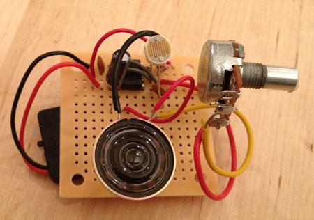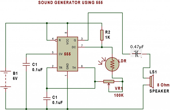 This Sound generator using 555 and LDR from www.buildcircuit.com is based on astable mode of 555 timer. This circuit demonstrates how resistance plays an important role in the output frequency of NE555 timer. When you change the resistance of the LDR you will hear the difference in output frequency.